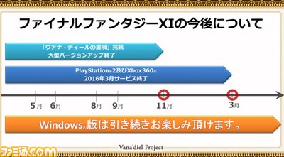 ファイナルファンタジーXIは、14年という長い期間運営を続けてきたわけですが、本家であるPS2版を始めXBOX360版のサービス停止、Windows版の開発終了となりますが、ヴァナ・ディールという世界は、終わりではありません、まだ別の形で残り続けます。どうか、これからも、ファイナルファンタジーXI、そして、ヴァナ・ディールの世界を皆様にお楽しみいただけるよう開発をしていきますので、どうかよろしくお願いいたします。