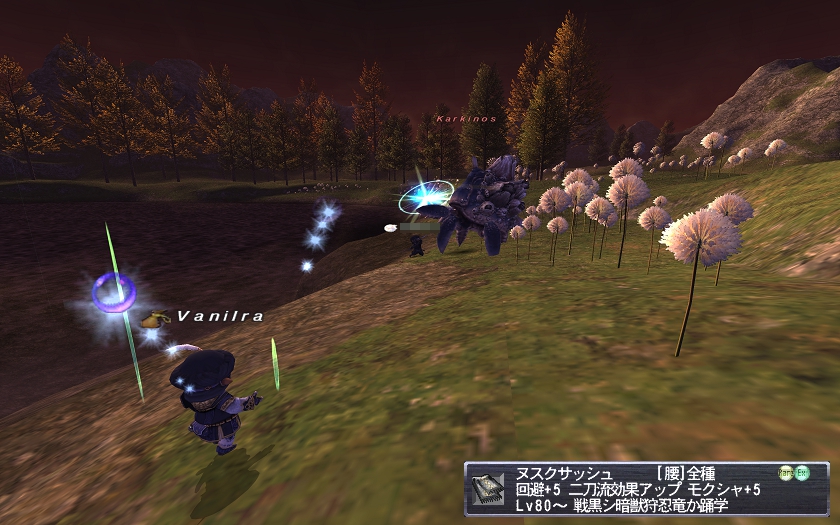 で、夜は、先輩の腰装備を取るために、ゴカイと釣り道具を買って、ラテーヌで釣り。先日、TBと一緒にやって取得したヌスクサッシュ取りの準備です。またのんびり1時間ほど釣りしながら、Narnさんを倒して、だいじなものを確保してから…ちょいと遊び心で、カエルになってみたり…
