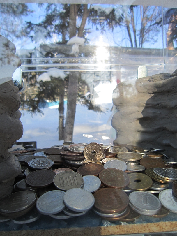 マリがいれたが50円⇒続いてうちの5円。まわりに、50円が見当たらないということは、マリの入れた50円が、うちの入れた5円ではじかれて、どうやら立ち上がったようです(*´ω`*)