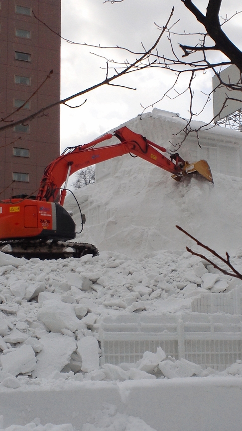 アフター雪祭り、案外取り壊す姿が豪快で、なかなか楽しめます!轟音と共に崩れていく雪の像を眺めると「あぁ、今日で帰るんだなぁ…」としんみりしてくるけどね。で、観光に足をすこぉーーーーーーーーしだけ伸ばして、旧北海道庁に歩いて向かいます。途中、マリが雪を固めて、様々なところに投げつけてました。うちに飛んでこなかったことを幸せに思うことにします(´-`)