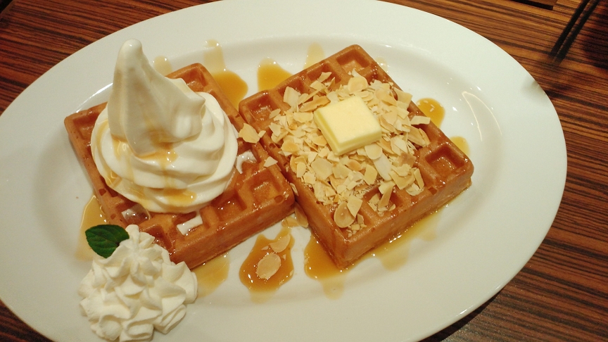 ご飯直後で、パフェは食べれなかったけど…2人で、ワッフル分け合いました。