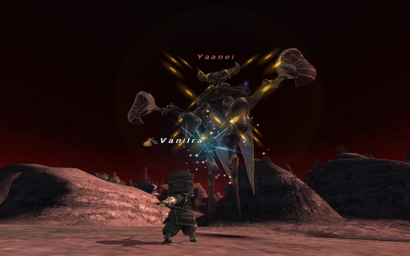 ガ系対策で、その場で後ろ向いてて貰えば良かったなぁ…とか思っても、あとの祭り。HPの多いおーくんモンクで、盾して貰いつつ、青探すも予想以上に時間かかってしまった。こんとき、青狙うのもやめとけばよかったけど、不思議なもんで、見える、狙えると、やりたくなる衝動に駆られてしまう…弱点が見えるというのは、こういう諦めみたいのが付けづらくなる罠がありますな。青弱点突いたあとは、残りの3分の1のHPを一気に削り落とそうと考えたんですが…ここで、まぁたバニラさん事故りまして…後衛のMPがないなか、後衛が範囲に巻き込まれて倒れたりと事故連発…。MPも枯渇してきたところで、おーくんがやむを得ず天神を使いました(TдT)うーわー…すまん…orz