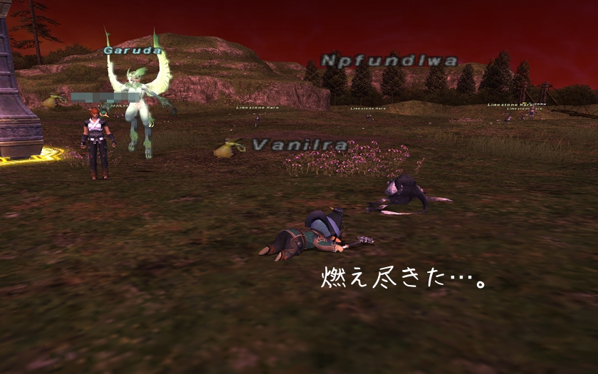 でも、削りきれなくて、うちが大・ピンチ。バニトラタイマーがピコンピコン言うてるでぇ!!その時、ログに流れ込む「アストラルフロウ」の文字…(・ω・)??なんだ、なにするんだ…タゲが一瞬でハル子に向いてタコ殴り…やばい、タゲ回収しないとー!!と一人でアタフタしてたら、アレキサンダーが登場、絶対防御を発動して…消えた。と、同時にハル子のHPバーも消えた…。
