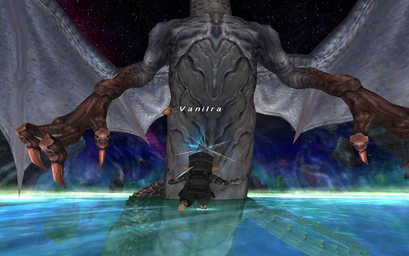 ガ系対策で、その場で後ろ向いてて貰えば良かったなぁ…とか思っても、あとの祭り。HPの多いおーくんモンクで、盾して貰いつつ、青探すも予想以上に時間かかってしまった。こんとき、青狙うのもやめとけばよかったけど、不思議なもんで、見える、狙えると、やりたくなる衝動に駆られてしまう…弱点が見えるというのは、こういう諦めみたいのが付けづらくなる罠がありますな。青弱点突いたあとは、残りの3分の1のHPを一気に削り落とそうと考えたんですが…ここで、まぁたバニラさん事故りまして…後衛のMPがないなか、後衛が範囲に巻き込まれて倒れたりと事故連発…。MPも枯渇してきたところで、おーくんがやむを得ず天神を使いました(TдT)うーわー…すまん…orz