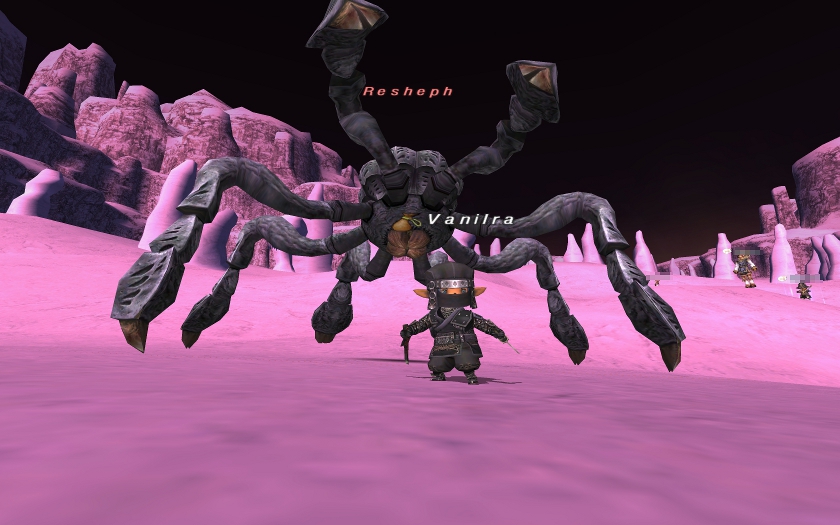 深夜に、おーくんのシフ手+2を作るために、ウルガランのクモNM。Reshephさん、こいつは、アビセアメインクエNMの1匹でもありますね。今回は、こいつを最小限の構成:3名で挑んできました!