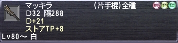 さてさて、どうなるか…とドキドキのWSルートですが…おおおおお!!マッキラ+1、ストアTP13ぐらいに跳ね上がってる!すげー!!と思って、浮かれてたのもつかの間…マッキラ、WSダメ+10%のほうに…片手棍WS+10%…。うーわー…作りなおしかよ、と新しいの受け取ろうとしたら、持てない……さようなら、マッキラ。