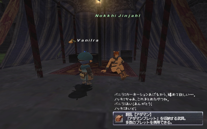 今日は、錬金師のひげさんに泣きついてお願いして、ジュノで立ち話しながら、アダマン弾補充させてもらった。競売は1ダースで、6万円だけど、素材買ってやれば、半額ぐらいで済む。こうでもしないと、アダマン弾は、連射はちとお財布に厳しい('A`)