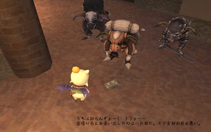 ウィンダスとか、タルとかモグとかのイベントとかクエとかは、こうでないと盛り上りませんな。で、呪いを解いてもらって、モグを助けだしたわけですが…モグの親分の息子が出てきまして、ぐうたらと家賃払わない冒険者呼ばわりされまして…前居住者(まさかのユーロ様?w)のぶんと合わせて、1000万G払えというわけです。