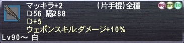 ③マッキラ+2:[キュラキュラ]が葬式状態に陥る原因となった棍棒で、D隔ともに優秀。WS+10%という響きに釣られて製作するも一度ゴミにされた棍棒。執念で、再び舞い戻り、さらに強化されて使いやすさNo1の座に。
