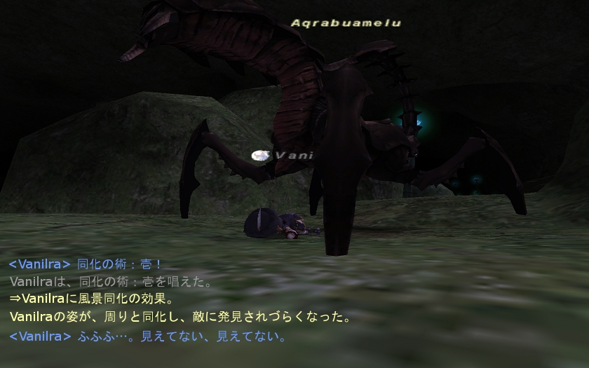 普通のサソリにディアしたら、こいつまできちゃったです…で、マラソンすること1分程、ついに技が発動…完全に、地面に同化して、敵は私の姿に気がつかなくなり、そそくさとその場を去りました。