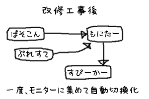 モニターを介さないと、音源の自動切換えは実現できないため、モニターのノイズを止める方法を考える。モニターをタコ足やめて、完全独立+PS3とパソコンも完全に独立させて、テストしてみたが、全然ノイズが止む気配なし。なにも改善されず。