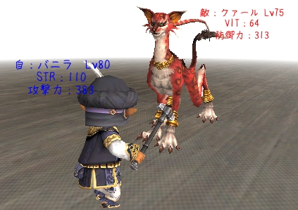 | [バニラ先生] はい、いわゆるこれが実践ってやつですね! 敵にも同じように、STRやVITというものがあります。 [生徒No.1] はい。なんとなく、そんな気がしてました。 [バニラ先生] で、なぜ、WSの威力を上げたいならSTRと言ったか… SV関数というのが存在するんです。 [生徒No.1] SV関数??? [バニラ先生] 自STR-敵VIT関数の略です。 [生徒No.1] ほうほう [バニラ先生] この場合、自STR110と敵VIT64で、勝ってます。 [生徒No.1] そうですね。 [バニラ先生] これが重要なのです! 上回ってる数字:46 ÷ 4= で、出た数字が 武器D値に、そのまま+されます。 [生徒No.1] え"!(((゜д゜;;;))) [バニラ先生] この場合、武器D58とすると… 58+((STR110 - VIT64) = 46 ÷ 4 = 10.75) = 69 小数点以下は切り捨てですので、実質D69です。 この数字を、いわゆる…固定D値と呼びます。 これに、さらに修正項目の値が+されます。 [生徒No.1] …そうか!!だから雑魚に対しては強くなるんですね? 雑魚だから敵VITが下がって、固定D値があがると。 [バニラ先生] そういうことです。 つまり、雑魚に対してもとてとてに対しても… 修正項目に関わらず、STRを上げる必要があります。 そして、修正項目だと、2回嬉しいわけです!! [生徒No.1] 仮に、敵VITより自STRが低いとどーなるんです? [バニラ先生] 逆に、固定D値が下がって、ダメージが下がります。 で、ここまで説明してきた内容で、WSのおおよその ダメージの計算ができるんですね…。 説明入ります!