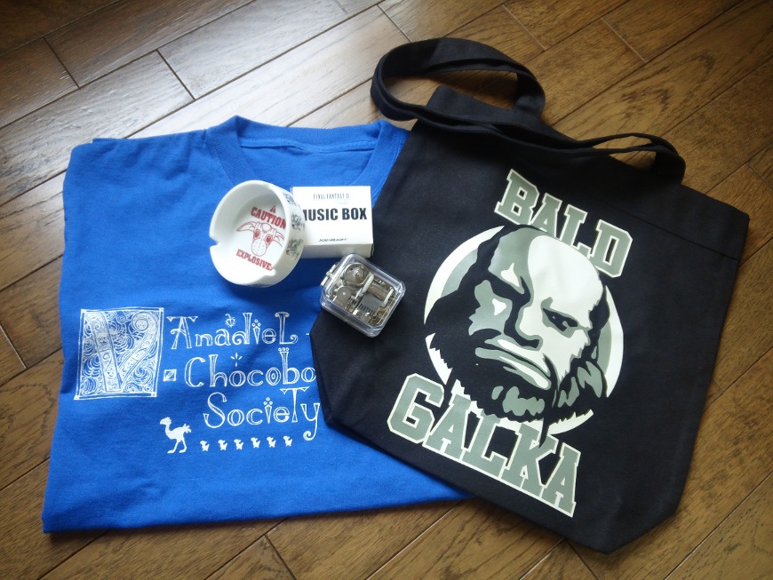 Windows版初回限定のオルゴール、ゴブリン灰皿、ガルカのトートバック、青色のチョコボTシャツです。オルゴールの収録曲は、ファイナルファンタジー11verメインテーマです。あのOPのクリスタルのシーンの曲ですね!