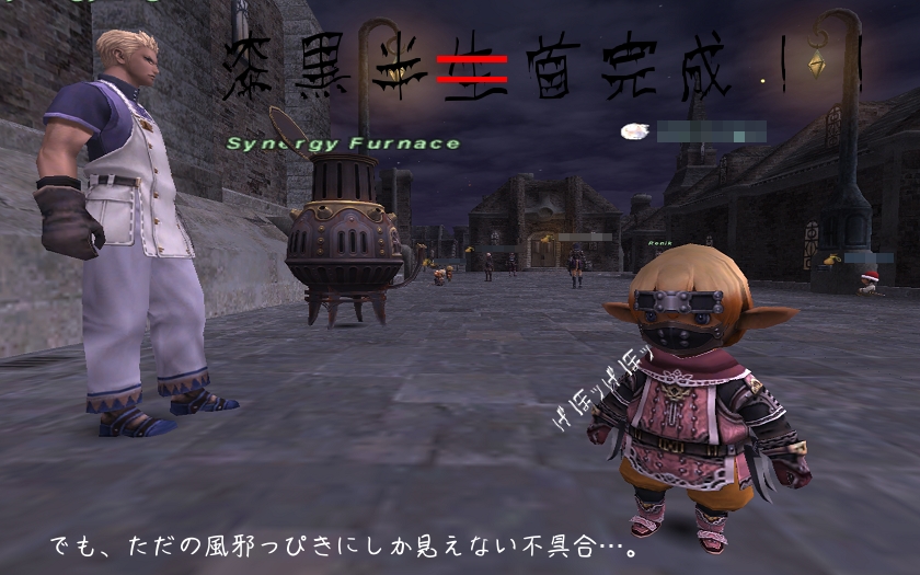 半分以上削ってたし、勝てそうではあったので、余計にくやしいですな…もう1人いれば、おそらく余裕で倒せるんだけど…2人で倒せなかった。というのが、むかつきます…だって、骨に強い臼で、しかもケアル貰ってたのに…。まぁ、今度90になってから、3人で型紙集めましょう。