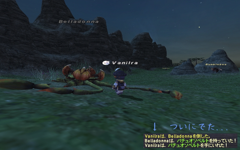 HPMP変換±70の指輪が1個でて、フリロだったので、ロットしてみたけど、もうありえない数字で負けまして…そのままその場で、落ち着いて何個か狙うことになったのですが、ヴァナ時間夜は、このNMは強化された状態になるようで、2回全滅チックしてるうちに、時間切れ解散。